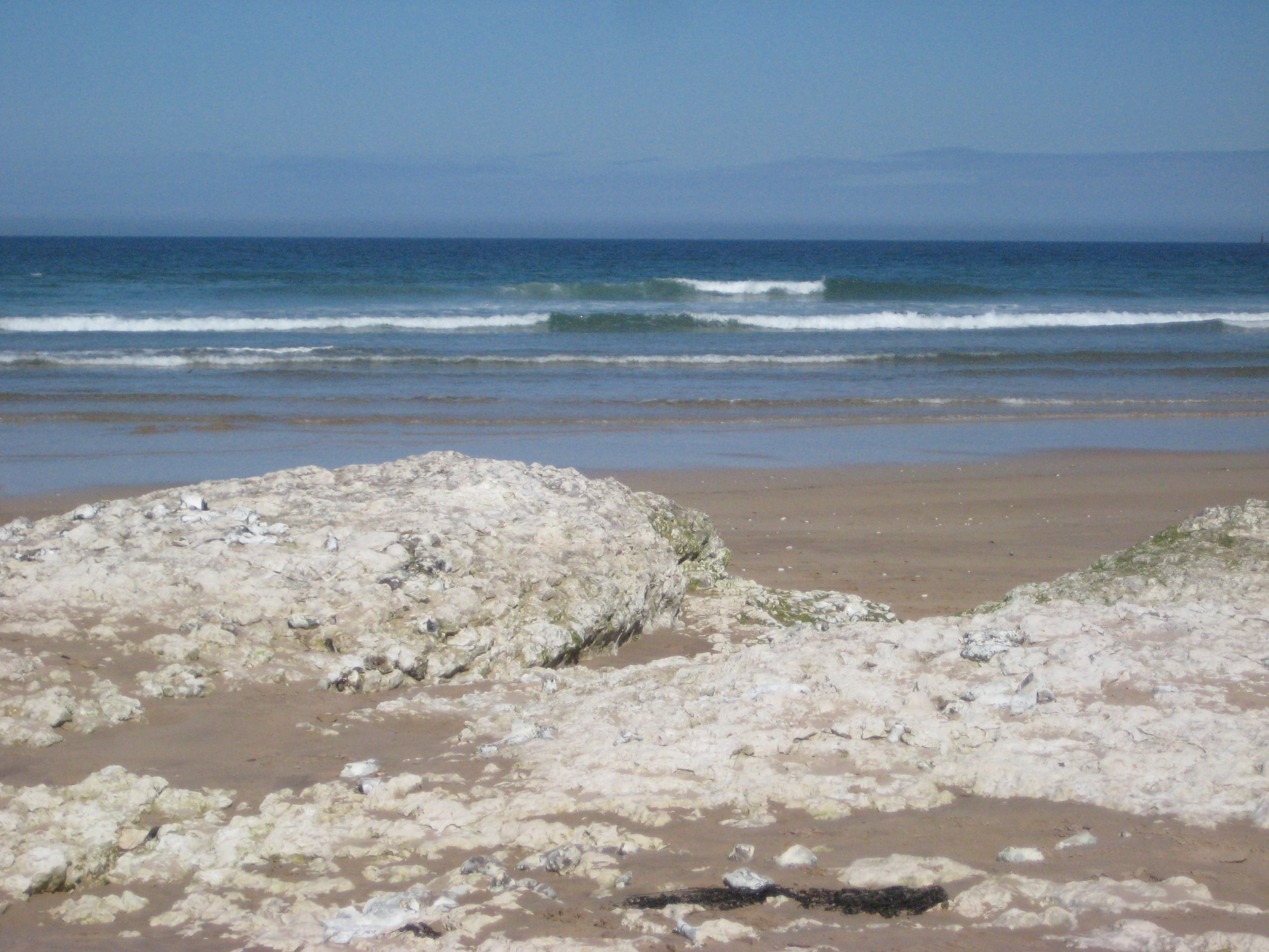 The sea also was a deep, rich blue with white waves cascading on the smooth beach. Behind us were towering white columns of chalk, which shields the bathers and surfers from the eyes of the road.